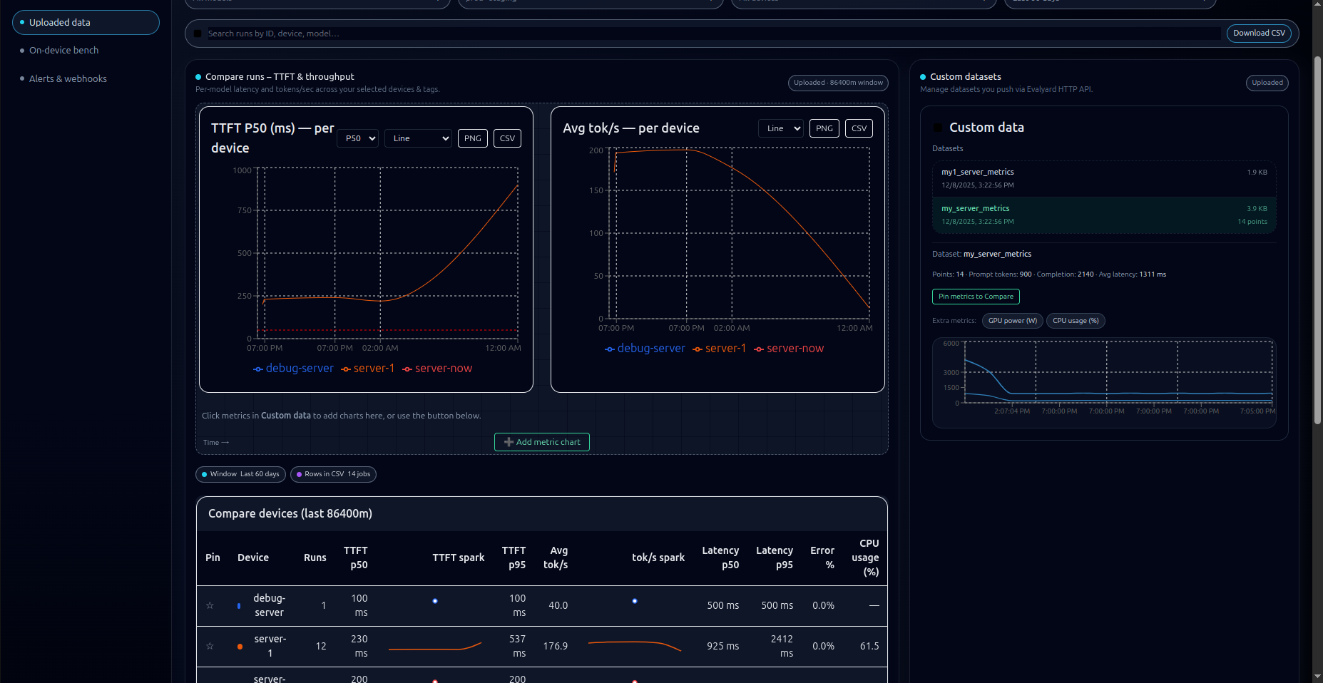 Evalyard is a hosted dashboard + a real Android device lab — TTFT, tokens/sec, P50/P95, throttling, temperature, and battery metrics.
